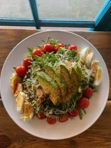 The menu leans fresh and balanced, with plates suited to a midday pause before continuing deeper into the high desert.